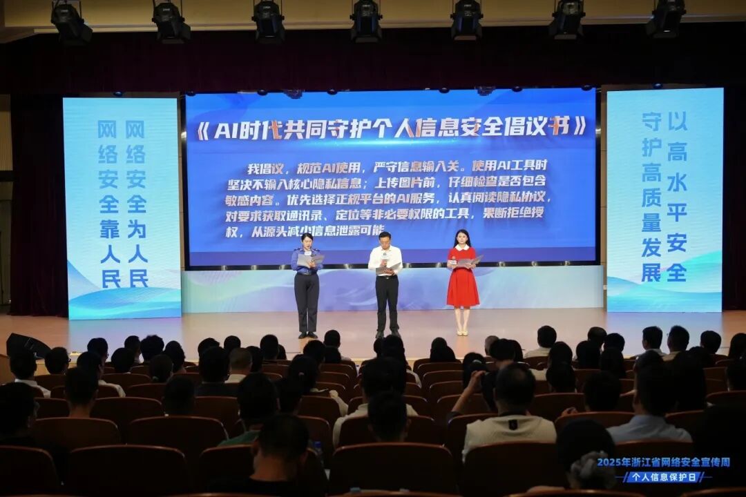 活动现场,嘉兴市秀洲区公安分局民警韩强就预防电信网络诈骗和网络安全进行了精彩宣讲;全国百个巾帼好网民故事代表、AI工程师、律师代表等围绕AI时代的个人信息保护问题展开深入探讨;劳模代表、三八红旗集体代表和文明家庭代表上台宣读了《AI时代共同守护个人信息安全倡议书》,呼吁全省广大职工和妇女群众树立网络安全意识,提升防范能力,以科学方法守护个人隐私,共同营造安全可靠的AI智能生活环境。